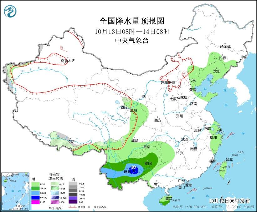 10月12日08時(shí)至13日08時(shí),西藏東部、青海北部和東部、甘肅西部、川西高原西北部等地部分地區(qū)有小到中雪或雨夾雪;西藏東南部、四川南部、貴州西部、云南中西部及海南島中東部等地部分地區(qū)有中到大雨,其中,云南西部局地有暴雨(50~60毫米)。西藏中部、四川盆地北部、河北北部等地部分地區(qū)有4-6級(jí)風(fēng);東海大部海域、臺(tái)灣海峽、臺(tái)灣以東洋面、巴士海峽、南海北部和中部海域、北部灣等海域有5~7級(jí)風(fēng)、陣風(fēng)8級(jí)。(見(jiàn)圖1)。