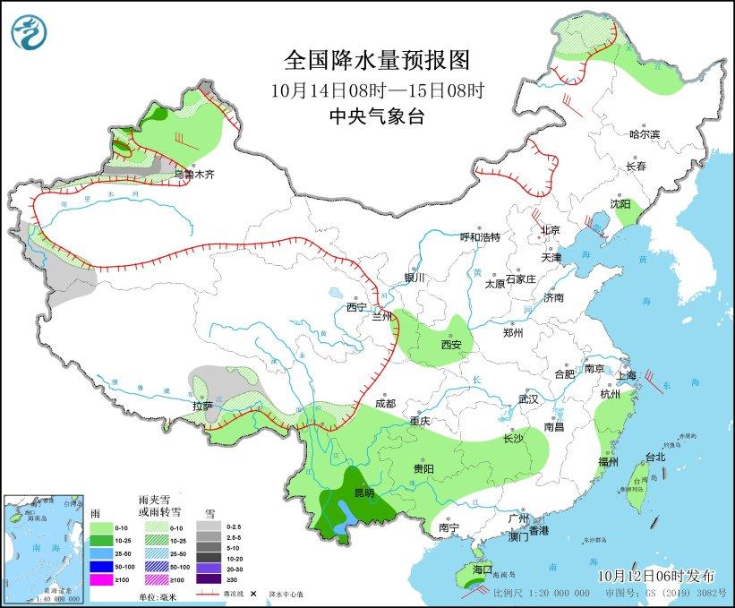 10月14日08時(shí)至15日08時(shí),內(nèi)蒙古東北部、新疆西部、西藏南部等地部分地區(qū)有小到中雪或雨夾雪;黑龍江西北部、遼寧東部、陜西南部、甘肅東南部、四川南部、貴州大部、云南、廣西西部、湖南中南部、江西西南部、浙江中東部、福建東部、海南島及臺(tái)灣島等地部分地區(qū)有小到中雨,其中,云南南部局地有大雨。內(nèi)蒙古東北部、新疆西北部、河北北部等地部分地區(qū)有5~6級(jí)風(fēng);渤海、渤海海峽等海域有6~7級(jí)風(fēng)、陣風(fēng)8~9級(jí)。(見(jiàn)圖3)。