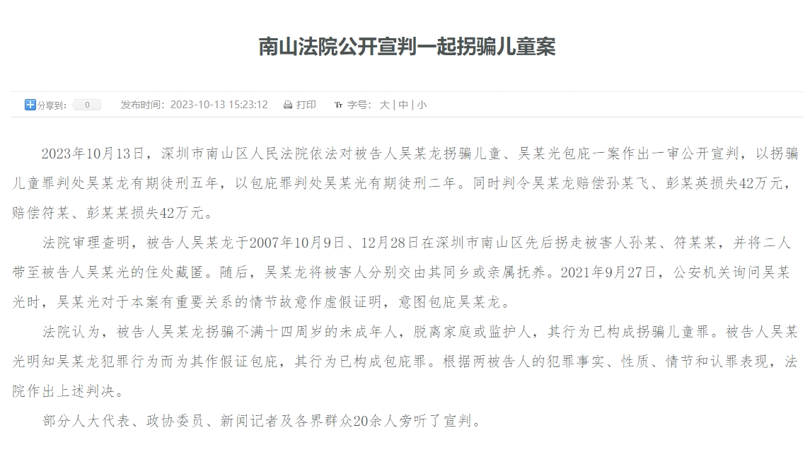 10月13日,深圳市南山區(qū)人民法院依法對(duì)被告人吳某龍拐騙兒童、吳某光包庇一案作出一審公開宣判,以拐騙兒童罪判處吳某龍有期徒刑五年,以包庇罪判處吳某光有期徒刑二年。同時(shí)判令吳某龍賠償孫某飛、彭某英損失42萬(wàn)元,賠償符某、彭某某損失42萬(wàn)元。