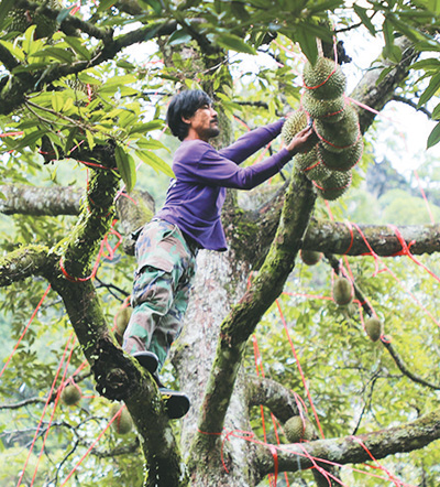 “一棵能結(jié)50至100個(gè)榴蓮,我們果園有200多棵榴蓮樹(shù),收入很不錯(cuò)?!碧崞鸾衲甑氖粘?,春蓬府薩威縣猜瓦果園的主人笑得合不攏嘴。