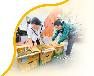 核查貨證、抽樣開(kāi)箱、剖果檢查……黃中磊和同事劉奇開(kāi)始按流程查驗(yàn)?!皺z查病媒及有害生物,未見(jiàn)異常;檢查包裝,未見(jiàn)異常;核對(duì)品名,未見(jiàn)異常;檢查標(biāo)簽標(biāo)識(shí),未見(jiàn)異常……”經(jīng)過(guò)認(rèn)真查驗(yàn),兩人確認(rèn)這批榴蓮查驗(yàn)合格,可以出證放行。