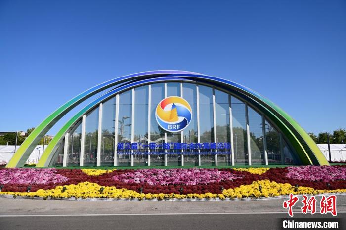 10月15日,北京,國家會議中心外的第三屆“一帶一路”國際合作高峰論壇景觀布置。當日,位于國家會議中心的第三屆“一帶一路”國際合作高峰論壇新聞中心啟動試運行?!≈行律缬浾?田雨昊 攝