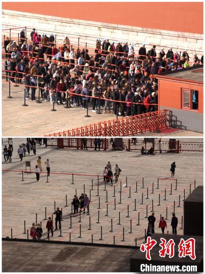上圖為10月20日9時(shí)許,故宮博物院午門外檢票現(xiàn)場(chǎng);下圖為10月19日13時(shí)許,故宮博物院午門外檢票現(xiàn)場(chǎng)?!」蕦m博物院供圖