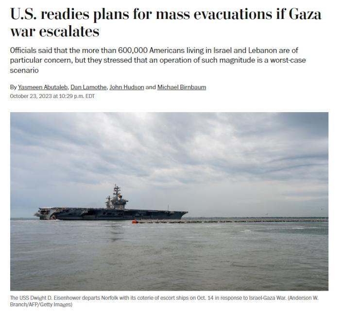 報(bào)道還稱,根據(jù)美國政府可能展開的撤離公民行動的規(guī)模,這場行動可能比以往的任何撤離公民行動都更加困難。此次行動可能涉及10月已經(jīng)“涌入”中東地區(qū)的美國空軍飛機(jī)和海軍艦艇。