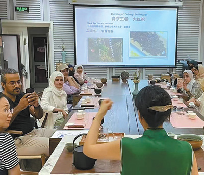 2023年7月,沙特中文學(xué)習(xí)者那丹(左三)在北京語(yǔ)言大學(xué)體驗(yàn)中國(guó)茶文化。