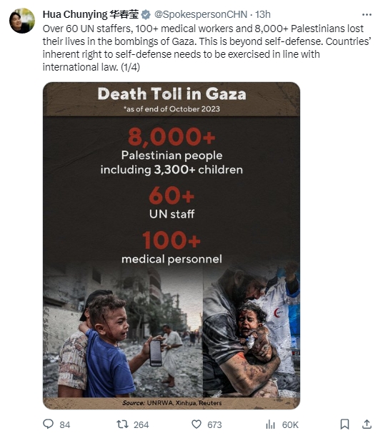 據(jù)報(bào)道,當(dāng)天,華春瑩發(fā)帖提及加沙地帶的人員傷亡。她稱,“超過(guò)60名聯(lián)合國(guó)工作人員、100名醫(yī)務(wù)工作者、8000名巴勒斯坦人在對(duì)加沙的轟炸中喪生。這超出了自衛(wèi)的范圍。各國(guó)擁有的自衛(wèi)權(quán)須依據(jù)國(guó)際法行使?!?/p>