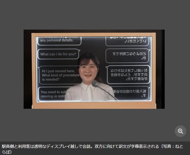該顯示屏被設置在西武新宿站正面入口特快售處的“外國乘客咨詢臺”附近,使用時間是從7時至20時。車站工作人員和乘客可以通過透明顯示屏顯示出的翻譯內容進行對話。