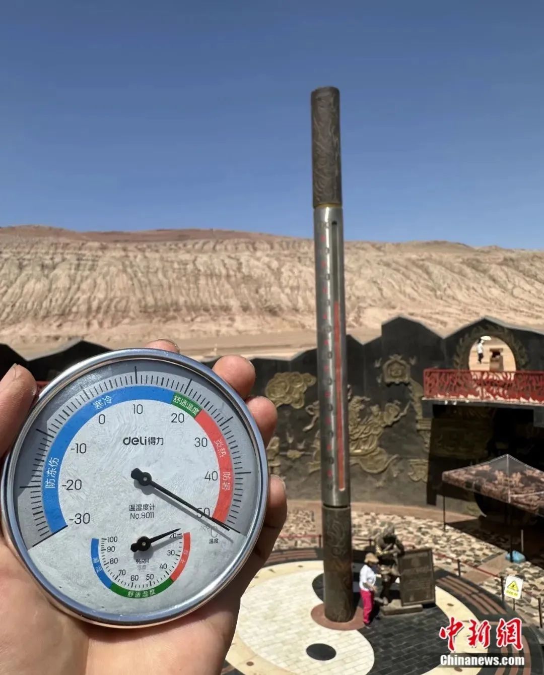 火焰山景區(qū)內(nèi)金箍棒溫度計(jì)溫度超50度。木塔力甫 攝