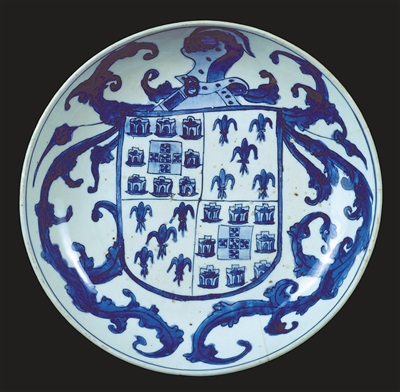 與此同時,葡萄牙貴族開始向中國專門定制紋章瓷器。據(jù)博物館陶瓷收藏館館長拉斐爾·阿爾費寧介紹,定制瓷器在葡萄牙的最早記載出現(xiàn)于1528年,即明代嘉靖年間。葡萄牙人非常珍視這些中國瓷器,甚至在返程途中給它們加飾銀制配件。由于當(dāng)時歐洲人多使用質(zhì)地粗糙的石制或陶制用具,設(shè)計獨特、淡雅脫俗且白皙光潔、能耐高溫的中國瓷器脫穎而出,備受珍視。當(dāng)時,葡萄牙貴族多以中國瓷器為地位的象征,定制瓷器一時間蔚然成風(fēng)。其中,由葡萄牙阿爾布克爾克家族定制的瓷盤尤具代表性:盤心繪有盾形紋章,配以十字形盾牌和百合花,藍(lán)白相間,光潔細(xì)膩。這件瓷器珍品既是歐洲藝術(shù)史上的美麗篇章,亦是中葡藝術(shù)交融出的靈感結(jié)晶。