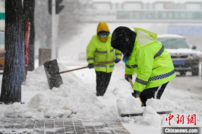 11月6日,環(huán)衛(wèi)工人在清理哈爾濱市街路上的積雪。趙宇航 攝