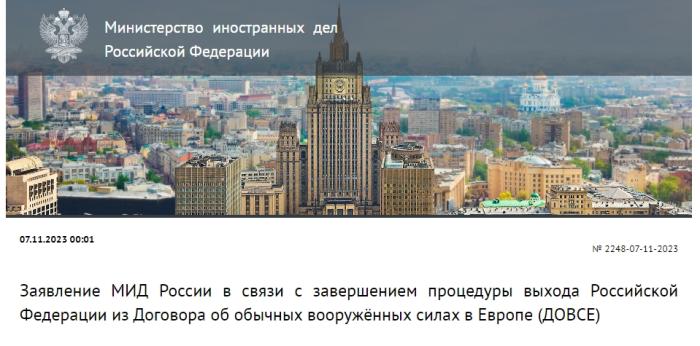 當(dāng)?shù)貢r間11月7日,俄羅斯外交部發(fā)布關(guān)于俄羅斯完成退出《歐洲常規(guī)武裝力量條約》程序的聲明。圖片來源:俄羅斯外交部網(wǎng)站