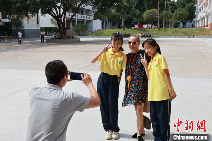 圖為飛虎隊后代與學生合影留念。 中新社記者 林馨 攝
