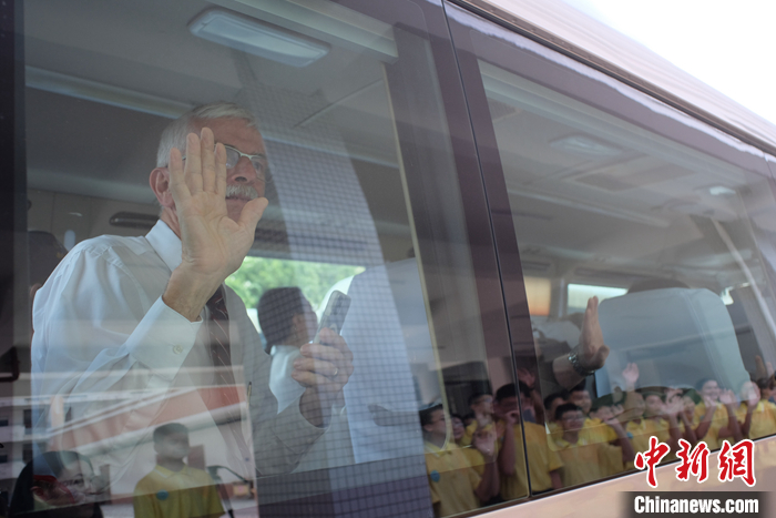 圖為臨別時,代表團成員與學生揮手告別。 中新社記者 劉俊聰 攝