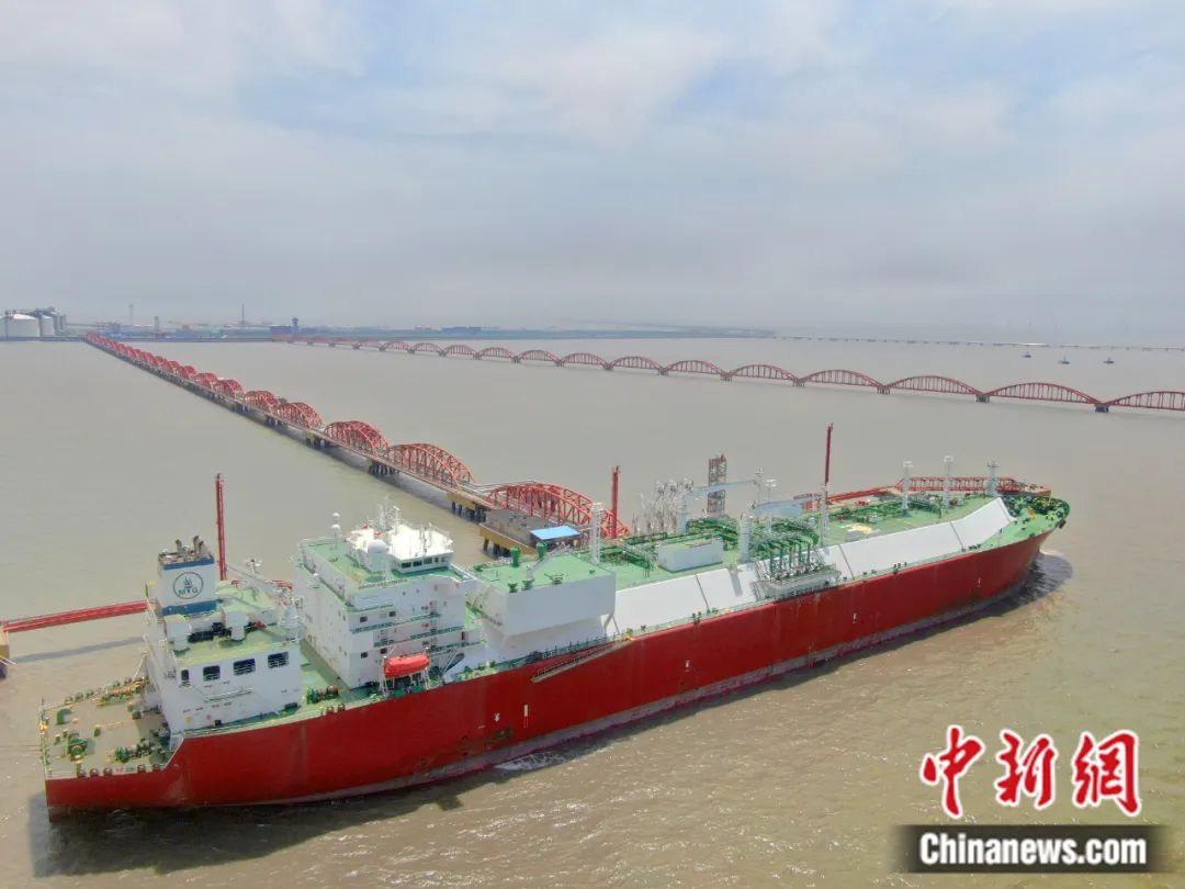 2021年5月,在江蘇省如東縣洋口港中石油江蘇LNG接收站碼頭,來(lái)自阿爾及利亞的“科洛尼斯”LNG船正在接卸進(jìn)口天然氣。許叢軍 攝