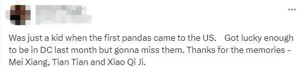 有網(wǎng)友回憶起與大熊貓的點(diǎn)滴時(shí)說,“當(dāng)?shù)谝慌笮茇垈儊淼矫绹?guó)時(shí),我還只是個(gè)孩子。上個(gè)月很幸運(yùn)能前往華盛頓,我會(huì)想念它們的。謝謝你們帶來的回憶——美香、添添和小奇跡?!?/p>