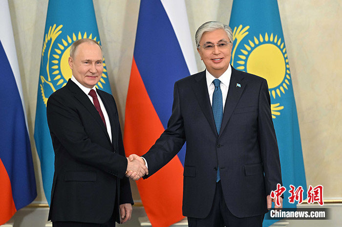 當(dāng)?shù)貢r(shí)間11月9日,哈薩克斯坦阿斯塔納,哈總統(tǒng)托卡耶夫與到訪的俄羅斯總統(tǒng)普京舉行會(huì)談。 中新社發(fā) 哈總統(tǒng)府官網(wǎng)供圖