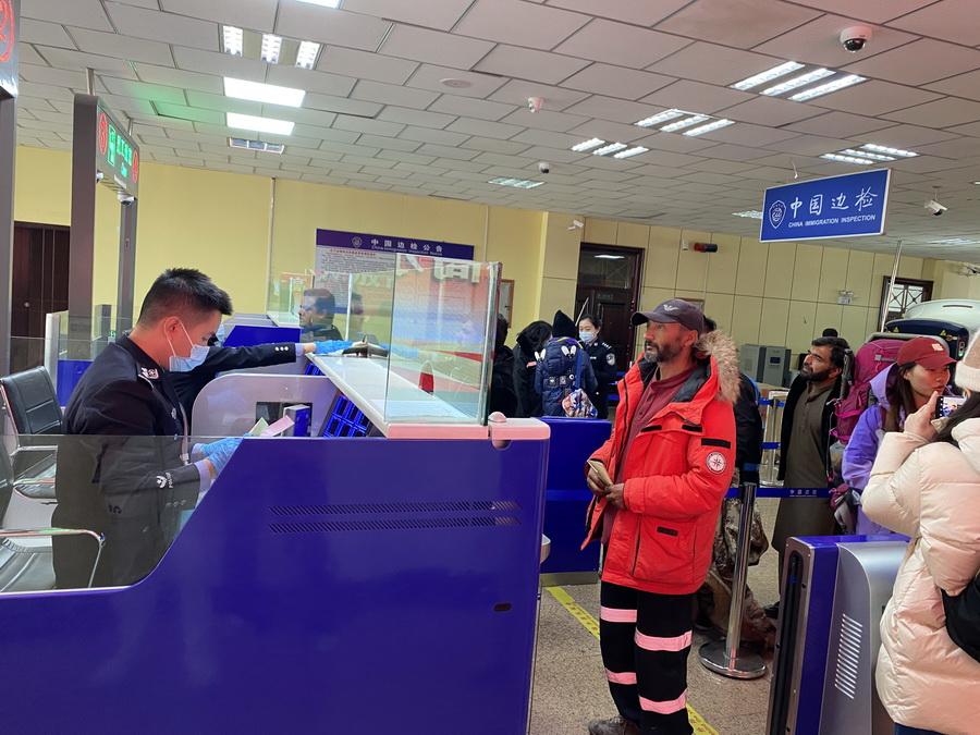 11月6日,紅其拉甫邊檢站民警為出境旅客辦理邊檢手續(xù)。(中國(guó)網(wǎng)記者 王冉 攝)