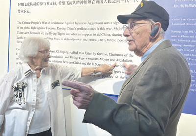 走進博物館,代表團成員在一張張老照片、一件件珍貴實物前流連,認真聆聽講解,還不時與身邊親友交談。麥克馬倫在展板上看到自己的名字后,興奮地向妻子珍妮弗指了指名字的位置。他曾擔任B—24轟炸機機頭炮手和助理飛行機械師,在昆明和成都參加對日作戰(zhàn)??粗AЧ窭锏恼蛊罚锌骸懊乐袃蓢嗣竦挠颜x將延綿不斷。”