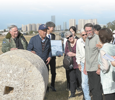 在云南昆明呈貢機場舊址,代表團一行聆聽講解員講述石碾背后的故事。呈貢機場曾是飛虎隊在昆明的主要基地之一,機場建設(shè)期間,當?shù)厝嗣窭瓌泳薮笫肫秸艿溃冻銎D苦努力。