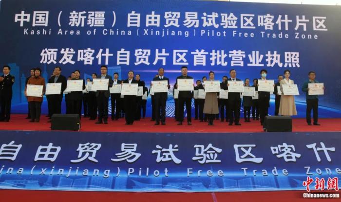 2023年11月11日,中國(新疆)自由貿(mào)易試驗(yàn)區(qū)喀什片區(qū)揭牌。圖為首批入駐自貿(mào)片區(qū)的經(jīng)營主體獲頒營業(yè)執(zhí)照。孫亭文 攝