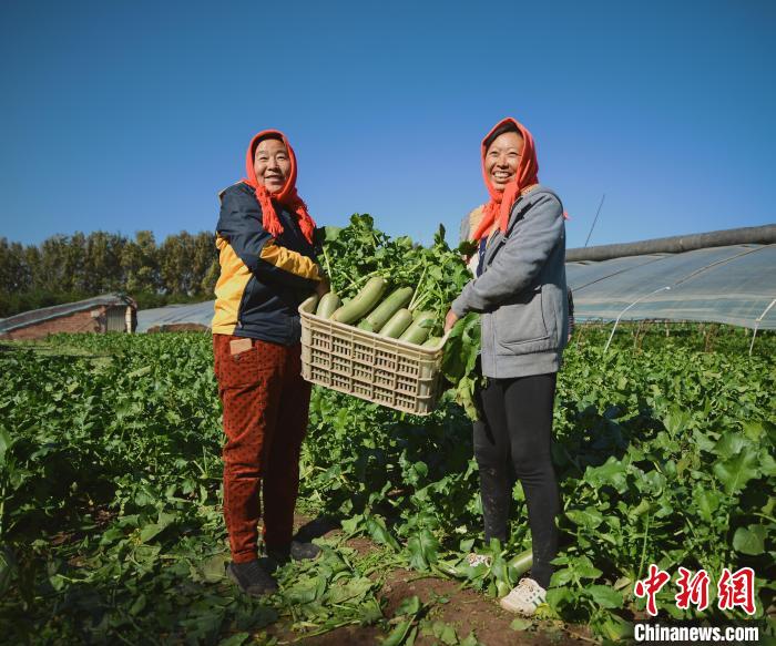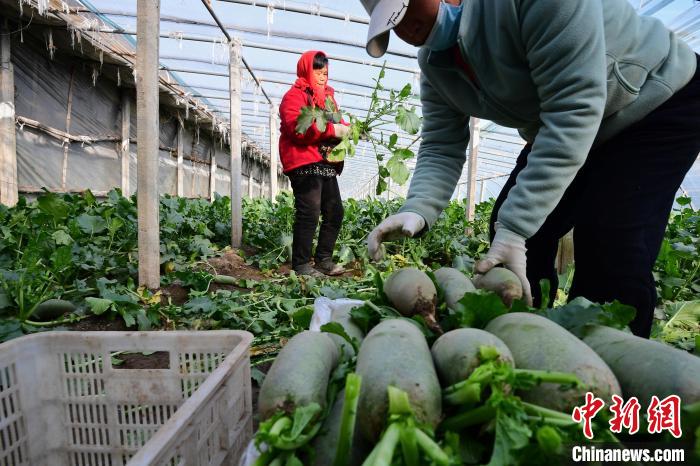 11月11日,天津西青區(qū)辛口鎮(zhèn)小沙窩村,村民在大棚中將采收后的蘿卜裝入筐中。天津市西青區(qū)辛口鎮(zhèn)古時(shí)歷經(jīng)多次河水泛濫,大量泥沙及有機(jī)物逐步沉積,形成特有的“上沙下粘”土壤條件,造就了沙窩蘿卜脆嫩多汁,口感清爽,味道甘甜。 中新社記者 佟郁 攝