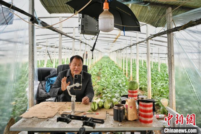 11月18日,在天津市西青區(qū)辛口鎮(zhèn)種植沙窩蘿卜的大棚內(nèi),農(nóng)民郭芝振通過(guò)手機(jī)直播推介沙窩蘿卜?!≈行律缬浾?佟郁 攝