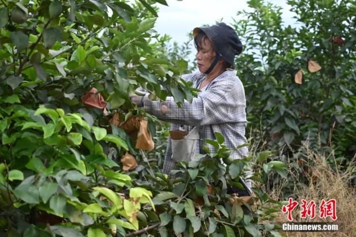 圖片圖為果農正在給檸檬套袋。張旭 攝