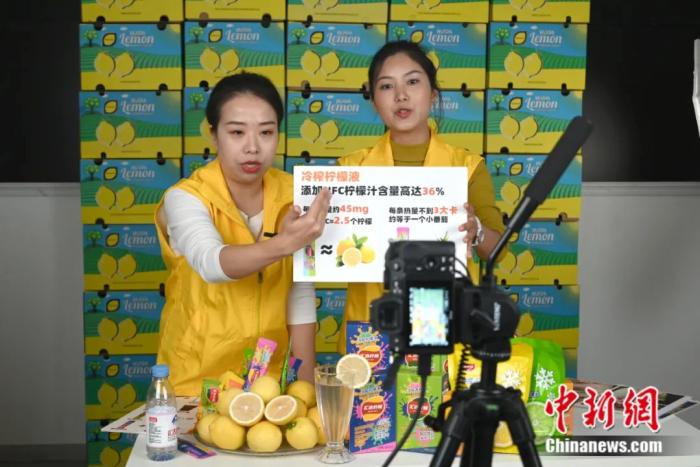 圖片圖為工作人員通過直播銷售檸檬。張旭 攝