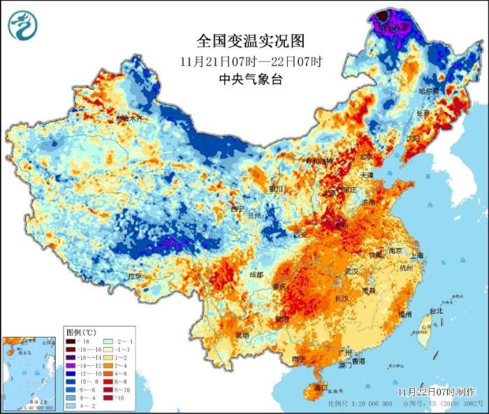 中新網(wǎng)11月22日電 據(jù)中央氣象臺(tái)網(wǎng)站消息,今晨,中東部大部地區(qū)仍有不同程度的回暖,但這也將是本輪寒潮過程來前最后的溫暖。目前冷空氣已經(jīng)開始影響黑龍江西北部,漠河今晨氣溫達(dá)到-27.3℃,比昨日同時(shí)刻降低20℃。中央氣象臺(tái)今晨繼續(xù)發(fā)布寒潮、暴雪、大風(fēng)三個(gè)預(yù)警。其中,未來24小時(shí),內(nèi)蒙古東部、黑龍江中東部將有大范圍強(qiáng)降雪,需要特別小心!