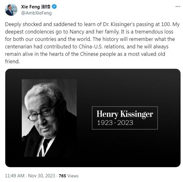 謝鋒寫道,“得知基辛格博士去世,享年100歲,我深感震驚和悲痛。我向南希(基辛格夫人)以及她的家人致以最深切的哀悼。這對我們(中美)兩國和世界來說都是巨大的損失。歷史將銘記這位百歲老人為中美關系作出的貢獻,他將作為最珍貴的老朋友,永遠活在中國人民心中?!?/p>