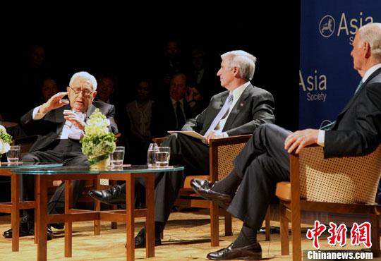 資料圖:美國前國務(wù)卿亨利·基辛格(左)與前國務(wù)卿詹姆斯·貝克等人進(jìn)行有關(guān)美中關(guān)系的對話。中新社發(fā) 王歡 攝