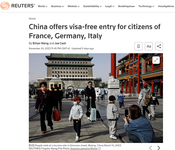 路透社報道稱,中國外交部宣布,2023年12月1日至2024年11月30日期間,上述國家持普通護照人員來華經(jīng)商、旅游觀光、探親訪友和過境不超過15天,可免辦簽證入境。
