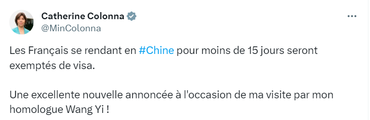 法國外長科隆納也表示:“我的同事王毅在我訪問之際宣布了一個很棒的消息!前往中國停留不超過15天的法國人將免簽。”