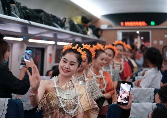 4月13日,老撾工作人員在中老鐵路上開(kāi)行的D887次國(guó)際旅客列車(chē)上表演。(新華社記者邢廣利攝)