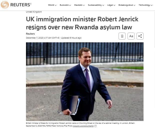 報(bào)道稱,詹里克對(duì)英國政府當(dāng)日公布的“盧旺達(dá)安全(庇護(hù)和移民)法案草案”持有不同意見。他在一封辭職信中表示,該立法是在2024年英國大選之前解決移民危機(jī)的“最后機(jī)會(huì)之一”。