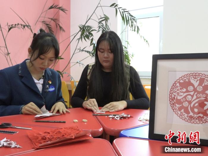 蘇慧娜與中國學生一同剪紙。呂盛楠攝