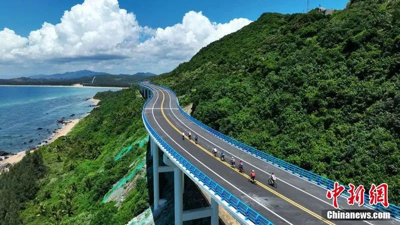 圖為海南環(huán)島旅游公路萬門嶺大橋臨崖路段吸引游客騎行打卡。楊師忠 攝
