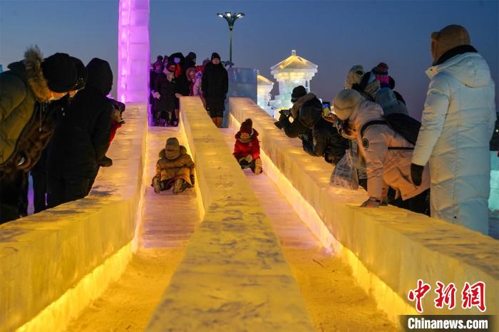 小朋友在哈爾濱冰雪大世界體驗(yàn)冰滑梯 趙宇航 攝