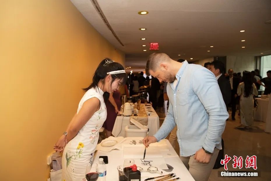 資料圖:當(dāng)?shù)貢r(shí)間6月29日晚,“何以文明”特展發(fā)布儀式在紐約聯(lián)合國(guó)總部舉行,與會(huì)嘉賓體驗(yàn)中國(guó)書法。中新社記者 廖攀 攝
