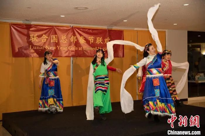 資料圖:當(dāng)?shù)貢r(shí)間1月20日,聯(lián)合國(guó)中國(guó)書會(huì)舞蹈團(tuán)在紐約聯(lián)合國(guó)總部舉辦的春節(jié)聯(lián)歡晚會(huì)上表演《格桑拉》。中新社記者 廖攀 攝