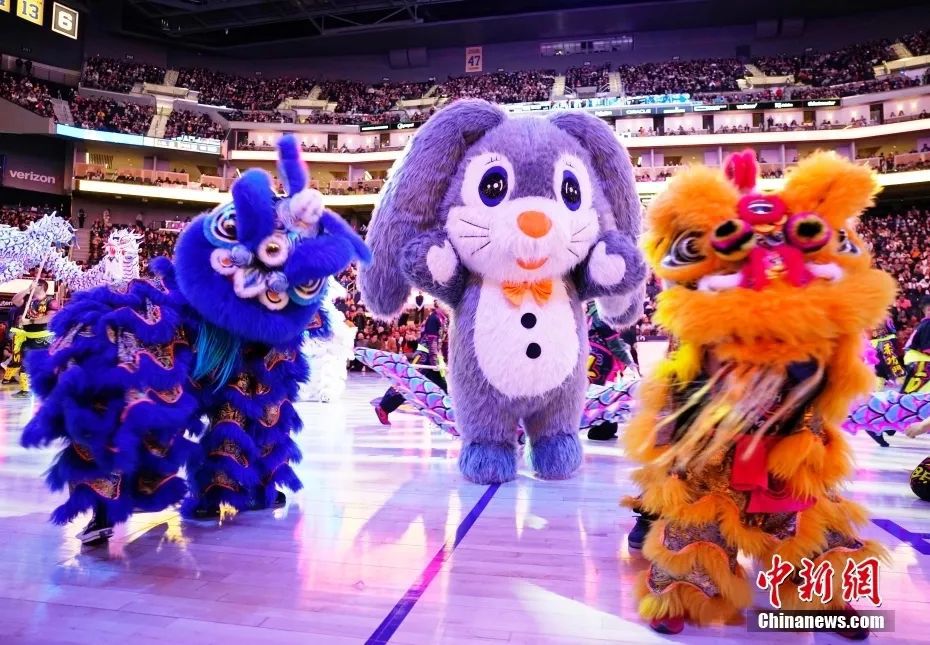 資料圖:當(dāng)?shù)貢r(shí)間1月22日,中國(guó)農(nóng)歷新年正月初一晚,美職籃(NBA)金州勇士隊(duì)在主場(chǎng)迎戰(zhàn)布魯克林籃網(wǎng)隊(duì)的比賽中,按照多年的傳統(tǒng)慶祝中國(guó)農(nóng)歷新年的到來。圖為兔子人偶出現(xiàn)在舞龍舞獅表演中。中新社記者 劉關(guān)關(guān) 攝