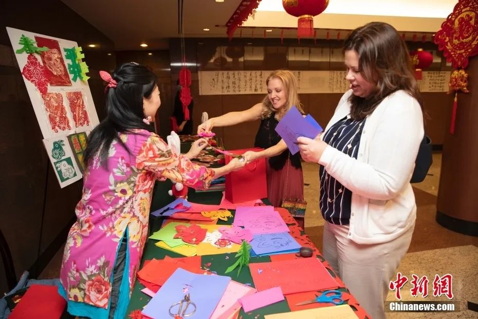 資料圖:來賓在招待會(huì)現(xiàn)場(chǎng)體驗(yàn)中國(guó)傳統(tǒng)年俗文化剪紙。中新社記者 廖攀 攝