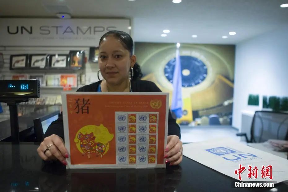 資料圖:2019年1月11日,為慶祝即將到來的中國(guó)農(nóng)歷己亥豬年,聯(lián)合國(guó)郵政管理處正式發(fā)行“中國(guó)農(nóng)歷生肖”系列己亥豬年特別版郵票。圖為紐約聯(lián)合國(guó)總部郵管處銷售點(diǎn)的工作人員展示己亥豬年特別版郵票。中新社記者 馬德林 攝