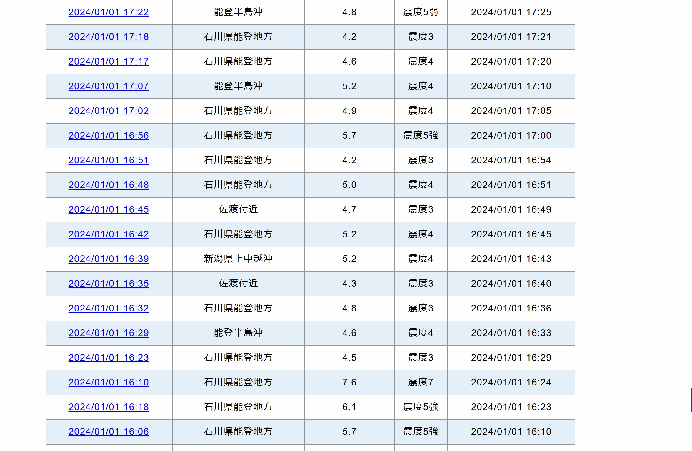當(dāng)?shù)貢r(shí)間16時(shí)06分至17時(shí)22分期間,石川縣能登地區(qū)附近發(fā)生至少15次地震,地震震級(jí)均在4級(jí)以上,其中至少有7次在5級(jí)以上。