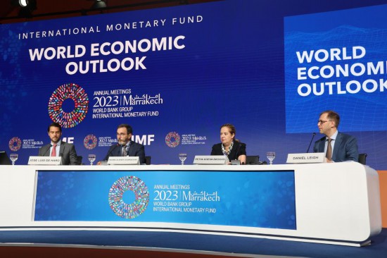 這是2023年10月10日在摩洛哥馬拉喀什拍攝的《世界經(jīng)濟(jì)展望報(bào)告》發(fā)布會現(xiàn)場。新華社記者霍晶攝
