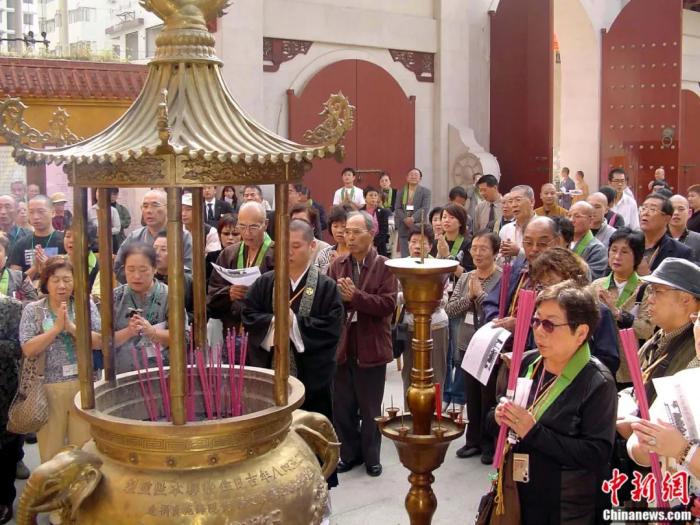 2004年,日本高野山真言宗佛教團(tuán)團(tuán)員在福州開元寺空海塑像前焚香祭拜空海大師。陳國明 攝