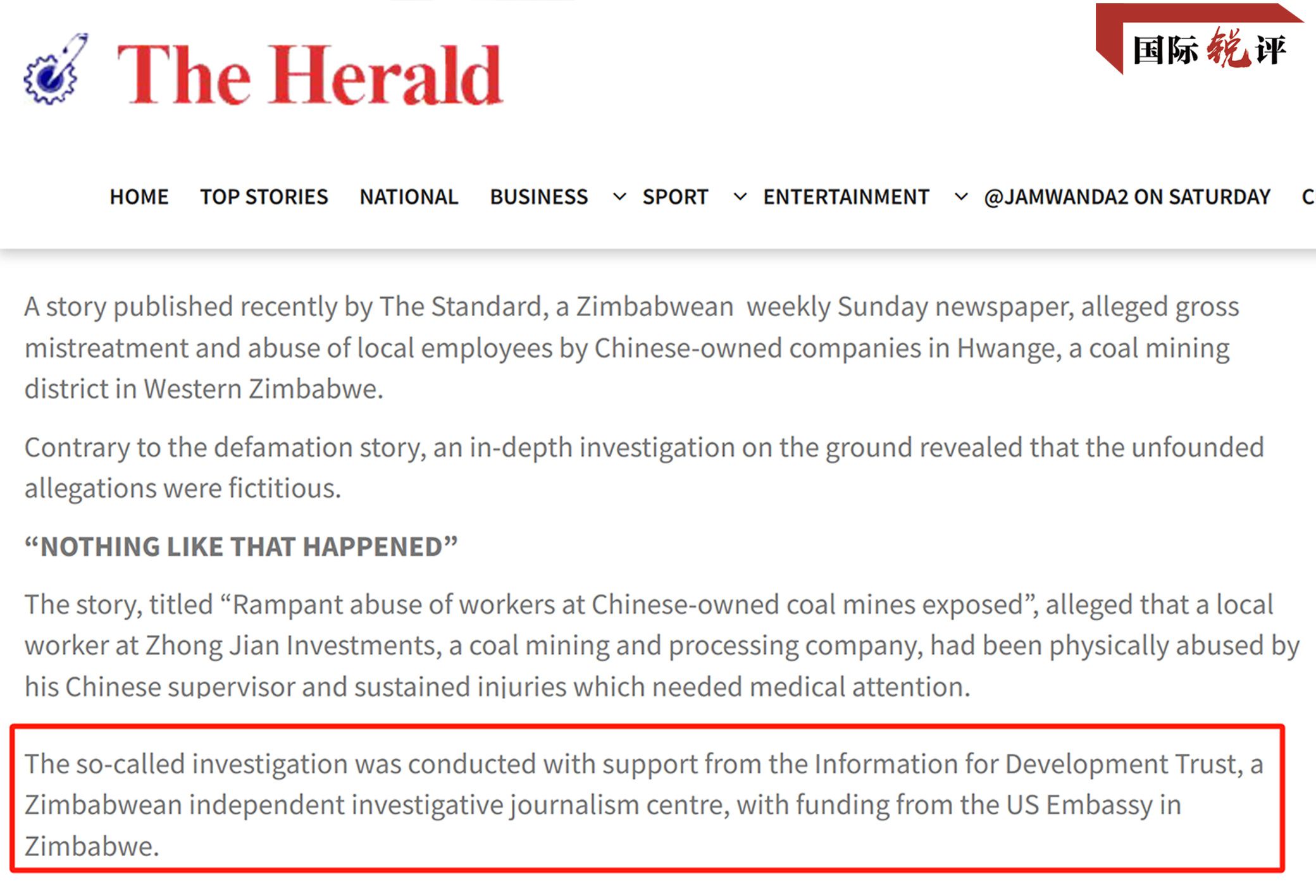 2022年5月,津巴布韋媒體《標(biāo)準(zhǔn)報(bào)》發(fā)布了一篇報(bào)道,污蔑中國(guó)礦企虐待當(dāng)?shù)貑T工,稱這名員工“受傷送醫(yī),還被解雇了”。這家媒體稱,報(bào)道是和津巴布韋一個(gè)名叫“信息促進(jìn)發(fā)展信托基金(IDT)”的機(jī)構(gòu)合作完成的。然而很快,津巴布韋《先驅(qū)報(bào)》就發(fā)文,用大量事實(shí)證明,這名員工只是和中方員工發(fā)生了小口角,并沒有被毆打,也沒有被解雇。