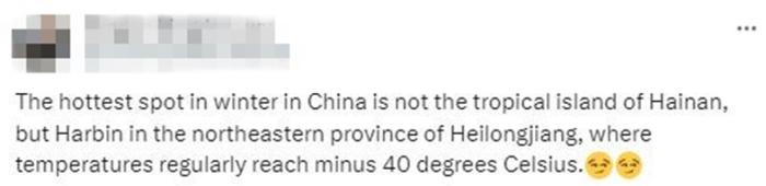 還有網(wǎng)友評論說,“中國冬天最熱的地方,不是海南島,而是黑龍江哈爾濱,盡管那里的氣溫會達到零下40攝氏度。”
