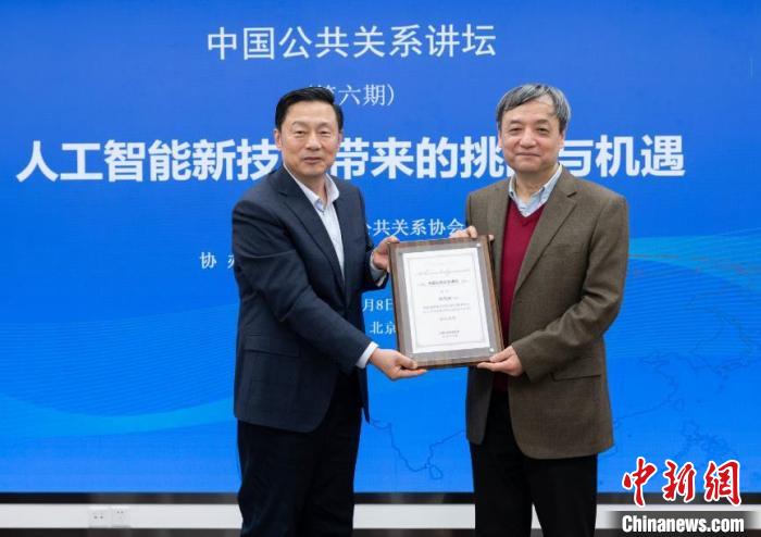 1月8日,中國(guó)公共關(guān)系講壇在北京舉行。圖為講壇結(jié)束后,中國(guó)公共關(guān)系協(xié)會(huì)會(huì)長(zhǎng)郭衛(wèi)民(左)向演講嘉賓、清華大學(xué)人工智能研究院常務(wù)副院長(zhǎng)孫茂松頒發(fā)榮譽(yù)證書?! ≈袊?guó)公共關(guān)系協(xié)會(huì)供圖。