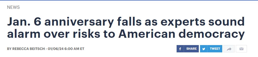 這項民調(diào)結(jié)果公布之時,正值“國會山騷亂”事件三周年之際,美國也迎來新的選舉年。《國會山報》網(wǎng)站在6日的報道中再次提到,目前美國出現(xiàn)了一系列與民主狀況有關(guān)的令人不安的跡象。